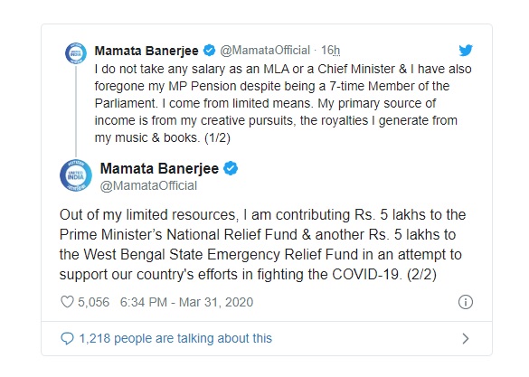 west-bengal-cm-mamata-banerjee-donates-ten-lakhs-for-prime-ministers-national-relief-fund-and-west-bengal-state-emergency-relief-fund